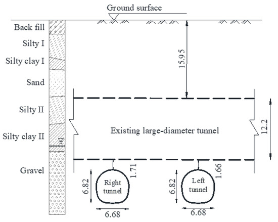 With the increased use of subway lines in highly populated metropolitan areas, new tunnels constructed beneath older tunnels are becoming more common [1,2,3,4,5,6,7]. The primary difficulties in such parallel tunneling projects are ensuring the safety and serviceability of the current tunnel while building the new tunnel. The mechanical characteristics of the existing tunnel are difficult to investigate, owing to the intrinsic intricacies of soil–tunnel interactions.