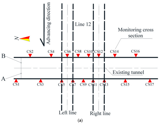 (a) Plane layout of the monitoring section along the existing large-diameter tunnel and (b) layout of the monitoring points.