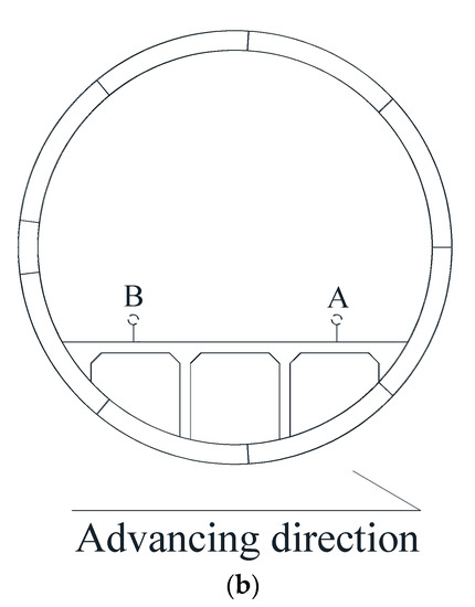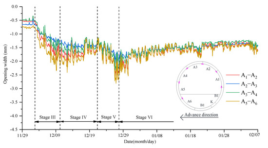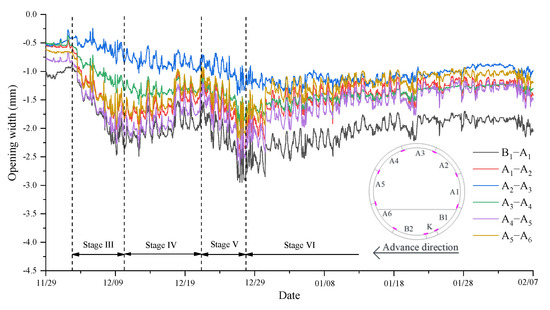 The opening width of the segment joints is critical for the tunnel’s structural safety, and an excessive opening size might result in groundwater leaking. The opening width of the joint was measured at each longitudinal joint position in this work, as illustrated in Figure 7.