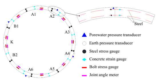 The deformation, stress, and joint displacement of the tunnel are continuously monitored according to the mechanical characteristics of large-diameter shield tunnels to enable the adjustment of new tunnel parameters and to secure the security of existing large-diameter shield tunnels. Figure 6 depicts the monitoring section configuration along the existing tunnel. The distance between the essential monitoring portions was 5 m (McS5-13), while the spacing between other monitoring sections was 6 m (McS14-15, McS1-4). A total of 17 monitoring sections were installed along the existing tunnel’s longitudinal direction. Figure 6b depicts the overall structure of the monitoring locations with existing tunnel sections. Two monitoring sites, denoted A and B, were installed on both rails of the up-and-down lines. It was also critical to monitor the increased load and joint displacement generated by the installation of new tunnels in existing tunnels. Given the current condition, the 6th and 12th monitoring portions of the existing large-diameter shield were chosen as the strain gauge, reinforcement gauge, and joint gauge monitoring sections. Figure 7 depicts the positions of each monitoring element’s measuring points. As can be seen in Figure 7 the reinforcement gauge was arranged symmetrically inside and outside, and the pressure box was arranged one segment apart. The installation direction of the bolt force and joint displacement was circumferential. Because the substructure was prefabricated, the surface seam gauge could not be installed in the substructure. The earth pressure is arranged on the outside of the segment and is poured with the segment. The steel bar stress and concrete stress meter were arranged on the inside and outside of the segment and were poured with the segment. The bolt stress measuring point was first arranged on the bolt and then installed on the segment. The site installation and layout are shown in Figure 8. Detailed information on the sensors is shown in Table 1.
