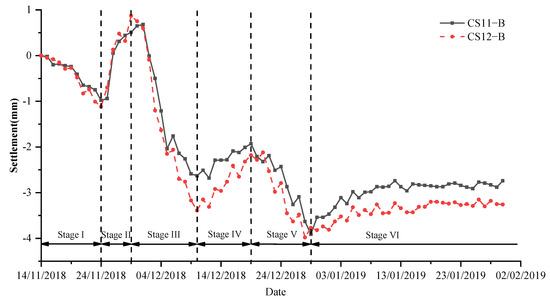 The deformation law of the shield tunnel of Line 12 between the Jimen Bridge and Dazhongsi interval under the existing Beijing-Zhang High-Speed Railway of Qinghua Park was analyzed, and the vertical deformation ephemeral curve of the existing tunnel is shown in Figure 9. According to the construction sequence and control measures of Line 12’s undercrossing construction, the settlement ephemeris curve of the existing tunnel was divided into the following six stages. MSC11-B and MSC12-B, which were positioned on the rail plate, had similar settlement tendencies. Depending on the monitoring data, six stages of vertical deformation development in the existing large-diameter shield tunnel were identified in the location of the new tunnel face and building measures, as shown in Figure 9, and the trend of settlement changes in each stage was categorized as follows: