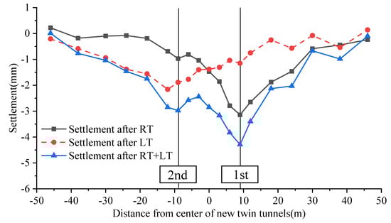 Figure 10 shows the measured settlement profile of Line 12 after crossing the existing large-diameter tunnel. As illustrated in the picture, the settling of the existing large-diameter tunnel induced by the crossing of Line 12’s right line was parallel with the centerline of the new right line tunnel. The maximum settlement was approximately 3.14 mm. The existing tunnel’s subsidence following the second crossing of the left tunnel was asymmetrical about the left tunnel centerline. The maximum settlement position deviated 3.0–6.0 m from the midline of Line 12’s left tunnel. This might have been due to the soil disturbance created by the initial crossing as well as the grouting reinforcing measures. Section 4.5 analyzes the reasons for the deviation of the maximum settlement position. The maximal settlement induced by the left line tunnel crossing was 2.16 mm, far less than the settlement generated by the first passing. The settlement part of the present structure was shaped like a “V” after the first crossing but like a “W” after the second crossing. The greatest settlements in the existing tunnel occurred where the new tunnel connected the existing structure, and special attention should be paid to crossing construction in the future.