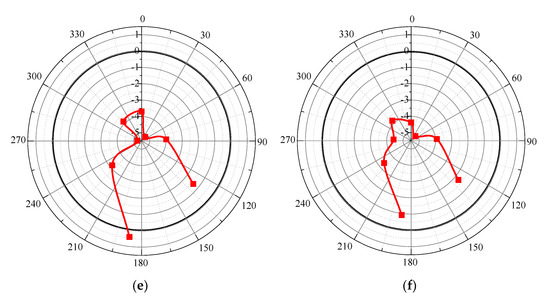 Induced hoop stress of the existing tunnel in the transverse section. (a) Far-field excavation; (b) Forepoling reinforcement; (c) Right line underpass construction; (d) Deep hole grouting in the left line and post-wall grouting in the right line; (e) Left line under crossing construction; (f) Grouting and stabilization behind the left line wall.