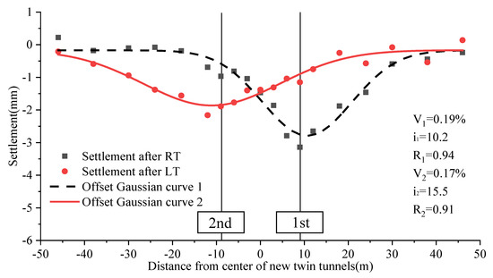 Furthermore, the existing large-diameter shield tunnel is a flexible construction, so the Peck equation can be utilized to characterize the settling trough generated by tunnel excavation [26]. However, in a complex metropolitan setting, the construction of double tunnels might have a greater impact on neighboring existing tunnels, and the ultimate settlement is not a simple superposition of two Gaussian distribution curves. The interaction between new twin tunnels is also the primary source of the asymmetric settlement profile. The settlement trough induced by the first tunnel excavation may be calculated using the Peck equation. Figure 14 depicts separate settlement profiles generated by Line 12’s twin tunnel excavation.
