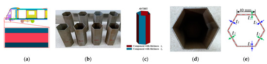 An adjacent variable thickness hexagonal tube (AVTHT) can be obtained by changing the adjacent wall thickness and maintaining the separated wall thickness consistent with a traditional hexagonal tube. To maintain the integrity of the structures and high machining accuracy, we manufactured the specimens (Figure 1b) using the wire-cut electrical discharge machining (WEDM) technique with aluminum alloy AA6061O blocks. WEDM is that the specimen must be pre-drilled with a hole to form the internal profile of the cross-sectional shape, and then cut through the specimen with wire according to the pre-programmed profile shape of the TW tube [23]. The surface roughness of these tubes is fairly small, and the crushing behavior is not affected by welding seams.
