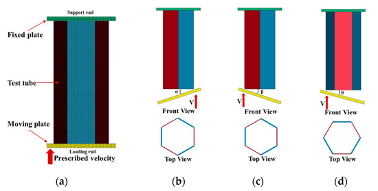 For the study conditions, as shown in Figure 2, we fixed the specimen tube on a stationary plate, and drove another plate to axially or obliquely compress the tube. Considering that, during the crushing process, EASs were usually subjected to various oblique loadings, we defined three loading patterns for oblique loadings. Pattern 1 (Figure 2b) is loaded along a side with a thinner plate (thickness = t1), and the loading angle is α > 0°; pattern 2 (Figure 2c) is loaded along a side with a thicker plate (thickness = t2) and the loading angle is β > 0°; pattern 3 (Figure 2d) means that loading is along a hexagon corner with θ > 0°.