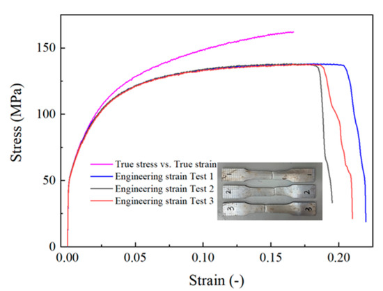 We first performed the uniaxial quasi-static tension test to obtain the material properties of the aluminum alloy AA6061O. The three material specimens were cut from part of the same structure and were prepared for the test (Figure 3). The test was conducted according to the standard of GB/T 228.1-2010 and the dimensions were determined by [26]. Three engineering stress-strain curves were obtained, and the standard deviation and coefficient of variation values of key points in the three curves are shown in Table 1. By processing the three curves, we obtained the average true stress-strain curve and extracted the parameters of the material properties, as shown in Table 2.