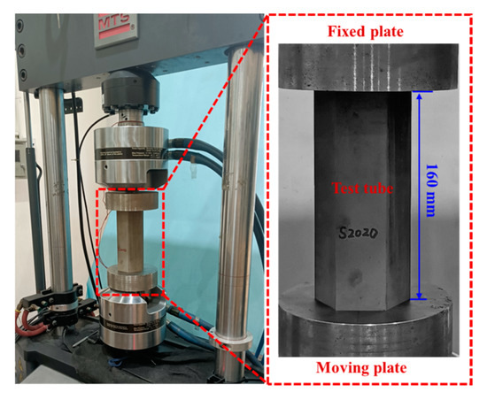 Though most EASs that were installed in front of railway vehicles or cars were mainly subjected to crashing loading, they were commonly investigated under quasi-static loading with a loading speed of 1–5 mm/min by many researchers [11,28,29,30,31]. This is because the experimental process in the quasi-static test is better controlled than that in the impact test, and the aluminum alloy AA6061O is not sensitive to the loading speed. Therefore, we performed quasi-static tests for AVTHTs made of aluminum alloy AA6061O to validate the FE models. As shown in Figure 4, the AVTHT was placed between the moving plate and the fixed plate, and the MTS Landmark testing machine drove the moving plate compressed upward to the AVTHT with a constant velocity of 4 mm/min. The testing machine did not stop loading until the displacement reached 120 mm. Then, we saved the data of real-time loading and compressive displacement.
