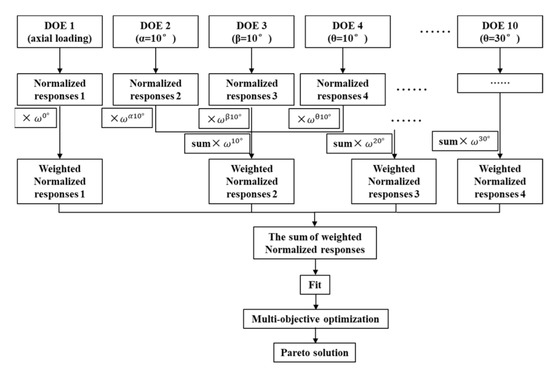 The normalized results of the three loading patterns under each oblique loading angle were weighted and summed. Then, we added up the four groups of results (axial loading, oblique loading with angles = 10°, 20°, and 30°) with corresponding weights. The results generated a new DOE that could be used to establish the surrogate model. Moreover, the validation points were also operated by the above steps, and a new DOE was generated for validation. Finally, using the validated surrogate model and optimization algorithm, we obtained optimal results considering the 10 loading cases, which were called Pareto fronts.
