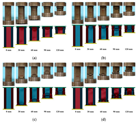 All the deformation processes between the two tests are basically the same; thus, the comparison here only shows the process of Experiment 1 in Figure 6. Note that all the AVTHTs deform with progressive folding mode, and most of the AVTHTs have no material tearing or failure. All the deformation modes and sequences maintained the same results in the simulations and the experiments, except for the sequence difference and slight tearing of specimen S1426 in the experiments. Material failure is not considered in the FE model since it is not the concern of the present work, and it is hard to predict its occurrence accurately [16]. In the literature [7], two distinct folding mechanisms were observed and distinguished: propagating hinge line (Mode I) and stationary hinge line (Mode II). The main features of the former are the hinge line moving and extension is limited to the neighborhood of the hinge line, and then extension occurs over an entire flange, which will be called Mode II. S2020 in simulations and experiments produces folds of Mode II and exhibits an extensional deformation mode, which is consistent with the conclusion in the literature [41]. The remaining three types of AVTHTs produce folds of Mode I and are exhibited in the inextensional deformation mode.
