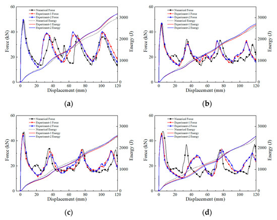 Energy absorbing curves for simulations and experiments: (a) S2020; (b) S1822; (c) S1624; (d) S1426.