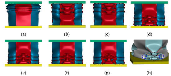 The simulation results of deformation modes for seven tubes: (a) S2020; (b) S1921; (c) S1822; (d) S1723; (e) S1624; (f) S1525; (g) S1424; (h) Folds.