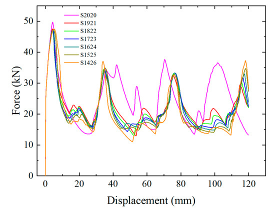 For force-displacement characteristics, the force-displacement curves of all tubes are shown in Figure 9. Note that all curves exhibit regular forms and characteristics. In the beginning, the force increases suddenly and reached the initial peak. Then, the force rapidly drops due to the generation of folds. The force-displacement curve of S2020 is obviously different from other curves due to the difference in the deformation mode. Moreover, the maximum initial peak value, 49.727 kN, is contributed by S2020, and its remaining peak values are also basically larger than those of the other curves. When , the corresponding force-displacement curves of the AVTHTs show high similarity. As the difference in plate thickness increases, the curves of the AVTHTs drop to lower trough values and reach greater values at the last peak force point, which can weaken the EA under axial loading.