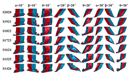 Three patterns were applied under each loading angle, and there were nine deformation results for a type of AVTHT. The final deformation modes of all AVTHTs after oblique compression of 120 mm are compared in Figure 10. For a type of AVTHT, when the loading angle is constant, different loading patterns cause different deformation modes. For example, S1525 deforms in inextensional mode with and ; however, it exhibits unideal deformation with . S1822 shows the bending and sliding mode with and ; no bending deformation can be found under . Moreover, as the loading angle increases, all the AVTHTs deform with the modes, which range from progressive folding modes to unordered and nonprogressive modes. For a constant loading angle and pattern, different AVTHTs show different deformation modes. Note that under , S2020, S1921 and S1822 deform with bending modes at the support end; S1723, S1624, S1525, and S1426 exhibit crease in the plate surface, and the bending position is closer to the midpoint of a tube. Additionally, AVTHTs under the loading patterns of pattern 3 (θ > 0°) are less prone to bending patterns compared with the other loading patterns. The results suggest that the loading angle, loading pattern, and thickness configuration can influence the deformation modes of AVTHTs.