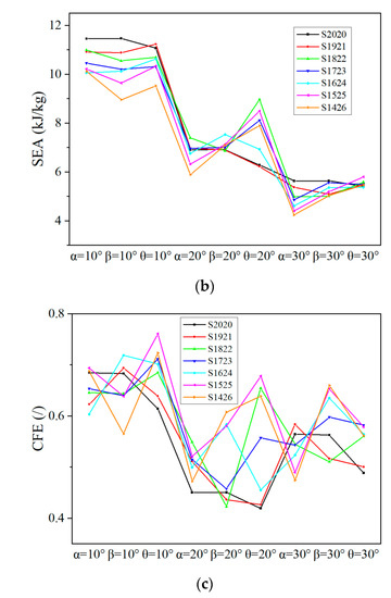 As the loading angle increases, SEA generally shows the same changing trend, compared with Fmax. For each tube, the SEA value is generally decreased with the difference of plate thickness increasing when the loading angle is 10°. A similar situation also occurs when . Note that the SEA could not decrease with the difference of the plate thickness increasing under other loading angles and patterns, such as and . For example, S1624 shows a higher SEA than S2020. This suggests that when an AVTHT is under a certain loading angle and pattern, changing the thickness configuration can improve the SEA. The CFE shows the maximal values when the loading angle is 10°, and the general CFE values under a loading angle of 20° are lower than those under a loading angle of 30°. The different tubes showed different changes, with the loading patterns changing under the same loading angle. The CFE of S1921 is decreased from 0.511 () to 0.426 (); the CFE of S1525 is increased from 0.521 () to 0.678 ().