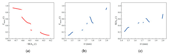 Using the MOGA, Pareto fronts are obtained and shown in Figure 13. The values of −SEAw and Fmaxw are negatively correlated for AVTHTs, which indicates that an increase in SEAw (decrease of −SEAw) leads to an increase in the Fmaxw. Because the two objectives are normalized values and cannot represent actual values, the pareto fronts are just meaningful for us to select appropriate thickness configurations. For example, if we prefer to design an AVTHT with the best performance for SEAw, the leftmost point (Figure 13a) is selected, and then we use the corresponding t1 to perform the simulation under all loading cases. Thus, we can investigate the specific crashworthiness performance of this design. Moreover, Figure 13b,c shows the curves of Fmaxw vs. t1 and SEAw vs. t1, and it can help us to determine more clearly which thickness configurations should be avoided in the design. For example, the rangs of should not be the design domain. In the pareto results, increasing t1 would not always increase the Fmaxw and SEAw. For example, when , increasing t1 would lead to decline of Fmaxw and SEAw.