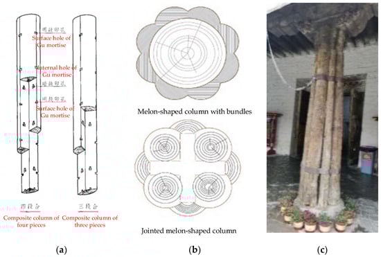 In the heritage timber structures of ancient Chinese buildings, the column is the most important bearing component in the stress system. Most of the beams, columns and other components of Chinese heritage timber structures are directly made of logs. However, as early as in Yingzaofashi [1], the concept of the composite column has been put forward, which is the practice of assembling large pieces of materials with small pieces when there were not enough logs available. The garlic petal columns of Baoguo Temple in Ningbo are the earliest masterpiece preserved in the case of composite columns and a polyprism structure with a similar composite form also exists in the Potala Palace in Tibet, as shown in Figure 1. The practice of the creation of the garlic petal columns of Baoguo Temple and Tibetan polyprism use are differently from that of the composite column that was recorded in Yingzaofashi, but the basic principle of them is the same. All of them used built-in mortise and tenon joints, external hoops or nails to combine small pieces of wood into larger pieces, so as to improve the bearing capacity and utilization rate of the materials.