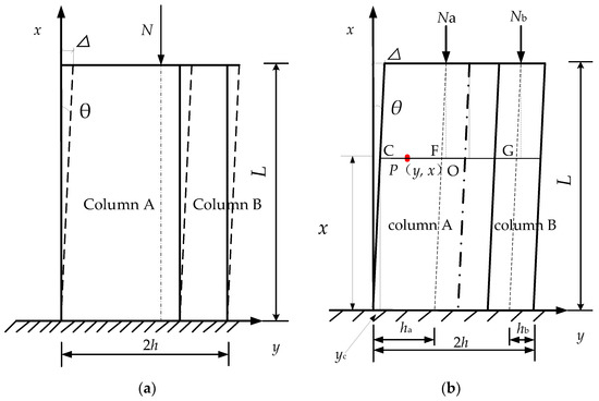 Each cross section along the column’s height still remains in a planar state when the composite column is inclined. It is assumed that the vertical stress on the cross section is linearly distributed in the y direction and uniformly distributed along the width direction. The force analysis diagram of a composite timber column in an inclined state is shown in Figure 2b. P (y, x) is any point in the composite timber column. The values hA and hB are the distance from the central axis of column A and column B to the edge of the column, respectively, and these meet the requirement of h = hA + hB. The following relations can be obtained from the geometric relationship: , .