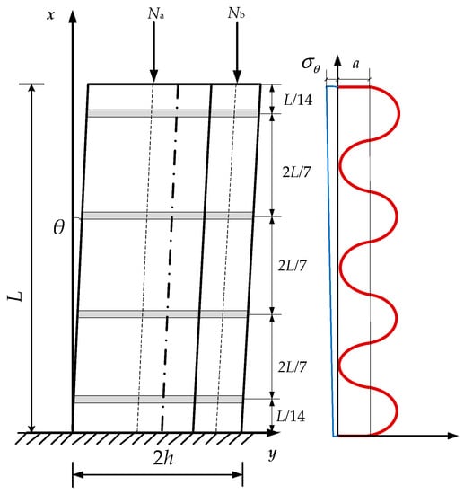 Due to the long-term influences of the upper structure and the environment, the wooden column will tilt to a certain extent, resulting in a lateral displacement of the top of the column. At this time, the included angle between the wooden column and the ground is less than 90°. Figure 2a shows a schematic diagram along the height and length when a composite timber column inclines under a vertical load. The left portion of the composite timber column is column A, and the right portion is column B. Column A and column B have the same height but different sizes. The vertical action of the upper structure on the composite timber column is simplified into a vertical concentrated load N and applied to the center of the top of the column. θ is the included angle between the edge of the composite timber column and the vertical direction when the column inclines. ∆ is the horizontal lateral displacement of the column’s top.