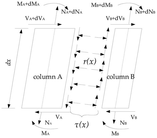 Furthermore, in order to calculate the slip displacement of the interface, any micro-element dx is taken along the column’s height direction for analysis, as is shown in Figure 5.