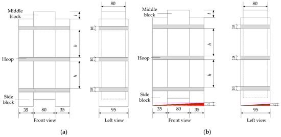 Specimen structure, unit: mm. (a) Non inclined specimen; (b) inclined specimen. Where Δ represents the chamfering height of the side block; l represents the initial distance between the top of the middle block and the top of the side block, which was taken as 20 mm in this test; h represents the distance between iron hoops.