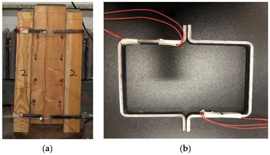 In this test, the side blocks were chamfered in order to simulate the initial inclined deformation of the specimens. When the horizontal lateral displacement ∆ of the top of the column was 7 mm, the inclination angle of the component was 2.67°. When the horizontal lateral displacement ∆ of the top of the column was equal to 9.3 mm, the inclination angle of the component was 3.43°. The structure and dimensions of the typical specimens are shown in Figure 6. The height of the side block and middle block was 360 mm, the section size of the side block was 35 mm × 95 mm and the section size of the middle block was 80 mm × 80 mm. The test was divided into 10 groups with 3 specimens in each group. The geometric parameters and the grouping of the specimens are shown in Table 1. The wood that was used in the test was larch (Larix principis-rupprechtii), which is commonly used in the wooden structures of ancient buildings in northern China, as shown in Figure 7a. According to the Wooden Structure Design Manual [22], the bending modulus of elasticity of larch (Larix principis-rupprechtii) is 1.29 × 104 N/mm2 and the compressive modulus of elasticity along the grain is 1.17 × 104 N/mm2. The iron hoops were made of Q235 steel, with a width of 10 mm and a thickness of 5 mm, as is shown in Figure 7b. The elastic modulus of the Q235 steel was taken as 200 GPa. The iron hoops were connected by bolts with a diameter of 5 mm.
