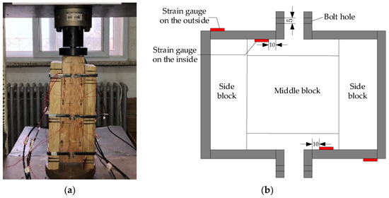 The test was carried out in the Mechanical Laboratory of Beijing Jiaotong University. The equipment that was used is a universal press with a range of 100 kN. The specimen was placed on the pedestal of the universal press during the test loading and it was ensured that the actuator of the universal press was located in the center of the top of the middle block, as is shown in Figure 8a. The test loading system adopts displacement control loading and the loading rate was 0.5 mm/min. A preload was performed before the test in order to ensure that the actuator of the press was in close contact with the specimen. Loading was continued until the sliding displacement of the interface exceeded 10 mm. The vertical displacement at the loading point, vertical load at the loading point and the positive pressure of the iron hoops on the combined interface were measured. The vertical displacement and vertical load at the loading point were obtained from a computer that was connected to the universal press. The positive pressure of the iron hoops on the interface was obtained by measuring the strain in the strain gauges that were arranged on the iron hoops. Figure 8b shows the arrangement of the strain gauges on the iron hoops.