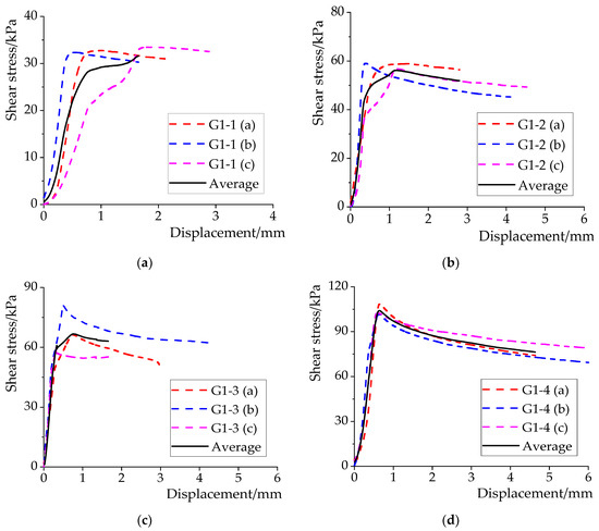 Shear stress–displacement curves of test groups with different numbers of iron hoops. (a) G1-1; (b) G1-2; (c) G1-3; (d) G1-4.