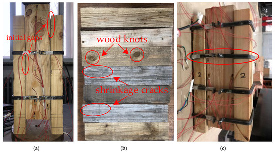 Test errors. (a) Initial gaps between the interface surfaces; (b) initial shrinkage cracks and knots in the wood; (c) inclined iron hoop at end of loading.