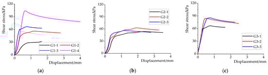The shear stress–displacement curves of the interface under different inclination angles are shown in Figure 11c. Figure 11c demonstrates that, under the same displacement, the shear stress of the interfaces of G3-2 (θ = 2.79°) and G3-3 (θ = 3.55°) were greater than that of G3-1 (θ = 0°), indicating that the existence of the inclination angle increases the shear strength of an interface.