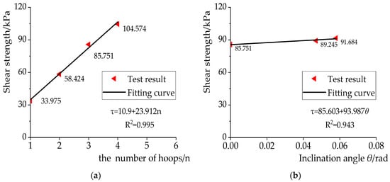 Fitting curves of shear strength. (a) The number of iron hoops; (b) the inclination angle of the interface.