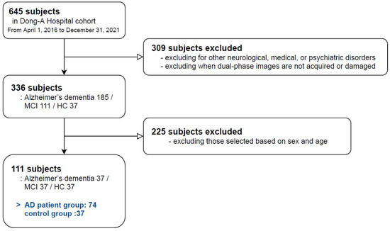 This study included subjects with dual FBB images who underwent FBB testing between April 2016 and December 2021 in the Dong-A University cohort. A total of 645 subjects underwent FBB testing during this period. We included 336 subjects, excluding those with neurological, medical, or psychiatric disorders and cases in which dual FBB images were not obtained or were damaged. The 336 subjects were classified according to their diagnoses into 188 patients with Alzheimer’s dementia, 111 patients with mild cognitive impairment diagnosis (MCI), and 37 subjects as healthy controls (HCs). Because the proportion of subjects in the three groups was very disproportionate, 37 patients with Alzheimer’s dementia and 37 patients with MCI who were the most similar based on sex and age to the HC subjects were selected (Figure 1). As a result, 37 subjects with Alzheimer’s dementia, 37 subjects with MCI, and 37 HC subjects were selected (Figure 2, Table 1). Each phase of the FBB image was confirmed by a nuclear medicine physician after collection, to ensure that the Aβ distribution labels were accurate. We classified subjects with Alzheimer’s dementia and MCI into an “AD patient group” and HC subjects into a “control group”. As a result, the subjects participating in the experiment were divided into two classes: AD patient group and control group.