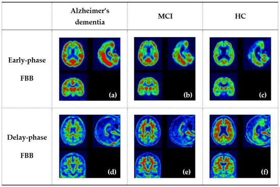 Figure 2. Dual-phase FBB images of subjects. The time range for dFBB is 90–110 min, and the time range for eFBB is 1.5–6 min. (a) eFBB image of Alzheimer’s dementia. (b) eFBB image of MCI. (c) eFBB image of HC. (d) dFBB image of Alzheimer’s dementia. (e) dFBB image of MCI. (f) dFBB image of HC. eFBB: early-phase FBB, dFBB: delay-phase FBB, dual FBB: dual-phase FBB, MCI: mild cognitive impairment, HC: healthy control.