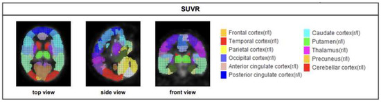 SUVR was obtained for 10 brain areas using the “view” program of PMOD. These 10 brain areas were averaged out of 67 areas in the AAL-merged volume-of-interest provided by PMOD (10 brain areas: frontal cortex (r/l), temporal cortex (r/l), parietal cortex (r/l), occipital cortex (r/l), anterior cingulate cortex (r/l), posterior cingulate cortex (r/l), caudate cortex (r/l), putamen (r/l), thalamus (r/l), precuneus (r/l), and cerebellar cortex (r/l)) (Figure 3). In the experiment, a composite SUVR [15] and regional SUVR were used. Composite SUVR is the average SUVR of the six regions (frontal cortex (r/l), temporal cortex (r/l), parietal cortex (r/l), occipital cortex (r/l), anterior cingulate cortex (r/l), and posterior cingulate cortex (r/l)). Regional SUVR is the SUVR of each considered in the composite SUVR.