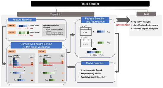 Here, F e , i and F d , j are the top feature combinations for each phase of the FBB; C is the feature set aggregated from a dual FBB and is used to extract the input variables for the predictive models. That is, C includes i + j feature combinations, and these combinations are used to create predictive models. In the comparison model with only a single-phase FBB (single FBB), without aggregating C , either F e , i   o r   F d , j is used to make the respective predictive models.