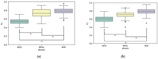 Figure 5. Boxplot of F1 score: (a) F1 score boxplot of composite SUVR experiment and (b) F1 score boxplot of regional SUVR experiment. F1: F1 score, * indicates the result of the Kruskal–Wallis test and post-hoc analysis to evaluate superiority, significant at p < 0.0001.