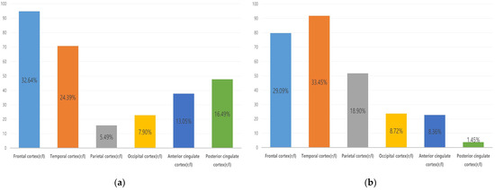 Table 5 and Table 6 list the frequency distributions according to the number of selected features in each phase. In other words, each region from Table 4 was observed in detail. For one selected feature, eFBB showed the largest frequency of frontal region features and dFBB of temporal region features. In the case of two selected features, frontal and temporal region features were the most observed in eFBB and dFBB. In the case of three and four selected features, increased frequencies of the posterior cingulate and anterior cingulate region features were observed in the eFBB, and parietal and occipital region features increased in the dFBB.
