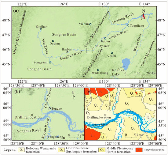 (a) Satellite map of Songhua River drainage; (b) satellite map of Tonghe area; (c) geology map of Tonghe area cited from BGMRHP [25].