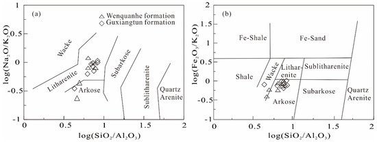 The major element compositions of the sedimentary strata are listed in Table 1. The Wenquanhe Formation and Guxiangtun Formation yield similar chemical compositions. The sediments from the Wenquanhe and Guxiangtun Formation have SiO2 contents of 69.62–77.03 wt.% (average 74.35 wt.%) and 67.32–78.17 wt.% (average 75.16 wt.%), respectively. The Al2O3 content of sediments are 9.72–15.03 wt.% (average 11.67 wt.%) and 9.37–15.60 wt.% (average 11.11 wt.%), which exhibit variations with the content of clay minerals. The high SiO2 and Al2O3 contents indicate a higher compositional maturity. Compared to the upper continental crust (UCC) [30], the sand compositions exhibit similar TiO2 and K2O contents. Moreover, they are depleted in other major elements, such as Fe2O3, MgO, MnO, CaO, and Na2O.