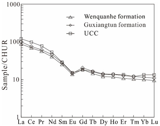The Wenquanhe and Guxiangtun Formations have very similar rare earth element patterns, so they were described together here. The REEs of sediments are approximate to the UCC, and the REE concentrations generally range from 95 to 208 ppm. The sediments are also characterized by LREE-enriched chondrite normalized REE patterns (Figure 5) and moderate negative Eu anomalies (δEuN = 0.66, δEuN = EuN/(SmN/GdN)1/2) without Ce anomalies, and these patterns resemble that of the upper continental crust [33]. Moreover, in contrast to the UCC, the sediments exhibit a slight HREE enrichment with an LREE/HREE ratio of 7.7 and LaN/YbN ratio of 8.5.