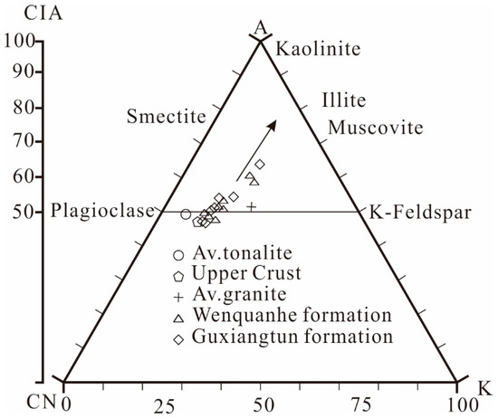 Moreover, the maturity and composition variations in sediments from the Songhua River have been influenced by the chemical weather process, as indicated by the chemical index of alteration (CIA). The CIA values of the sediments from the Songhua River range between 47 and 64 (Table 1), which is more than the CIA value of the UCC (about 46). In the A-CN-K diagram (Figure 6), the sediments follow the trend of the chemical weathering process, implying that the sediments have undergone a certain degree of chemical weathering. From the bottom to the top, the CIA values of the Wenquanhe and Guxiangtun Formations show an increased trend, indicating a gradual weathering of the source regions. The CIA variation in sediments from the Songhua River is mainly or partly controlled by lithology, because the sediments with a higher weathering degree have much more fine grains and clay materials. According to fossils of woolly rhinoceros and mammoth, the climate in the research area became cold from the early-middle Late Pleistocene to the late Late Pleistocene Epoch when the Guxiangtun Formation was deposited, and it became warm after the beginning of Holocene [25]. The climate during the last 2 Ma would influence the compositions of the sediments [35]. So, the climate factor that influenced the chemical weathering in the research area is a long-term action.