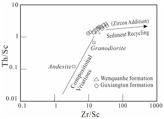 The Th/Sc vs. Zr/Sc ratios plot for the Guxiangyun and Wenquanhe Formations.