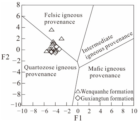 The variable size, roundness, and morphology of particles (Figure 3a–c) indicate that the protoliths of the Songhua River sand belonged to multiple terranes that involved weathering and sorting. Roser and Korsch [36] provided a convenient scheme to determine the provenance of sediments, in which concentrations of major elements were used. In the discriminant function diagram after Roser and Korsch [36], most of the samples fall within the quartzose sedimentary field (Figure 8), and part of the samples fall within the felsic igneous provenance field. Sorting and weathering would make provenance deviate from felsic igneous provenance [37], so the provenance may contain more felsic igneous materials.