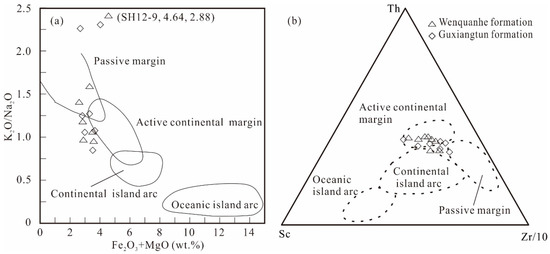 The major and trace element compositions of sediments have been widely used to identify the tectonic setting of their deposition [1,8,10,29,38]. According to the Fe2O3+MgO vs. K2O/Na2O diagram [41], the sediments from the Songhua River were plotted mostly close to the field of the active continent margin (Figure 9a). In addition to major elements, immobile trace elements with stable geochemical characteristics (e.g., Th, Sc, and Zr) had been used to identify the tectonic setting of sediments [1,8,10]. On the Th–Sc–Zr/10 diagram (Figure 9b) [1], the sediments fall into or near the field of the active continental margin.