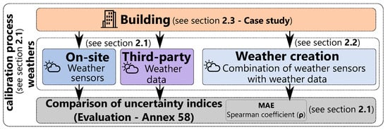 The article is structured as follows. Section 2 explains the steps taken to achieve the objectives set out in this paper, the proper simulation and calibration process (Section 2.1), and the weather file creation for the simulations (Section 2.2). Section 2.3 explains the case study used, corresponding to the monitored houses of Annex 58, and the calibration and evaluation periods taken into account. Section 3 shows the results obtained after the simulations and calibrations were performed. Finally, Section 4 presents the conclusions.