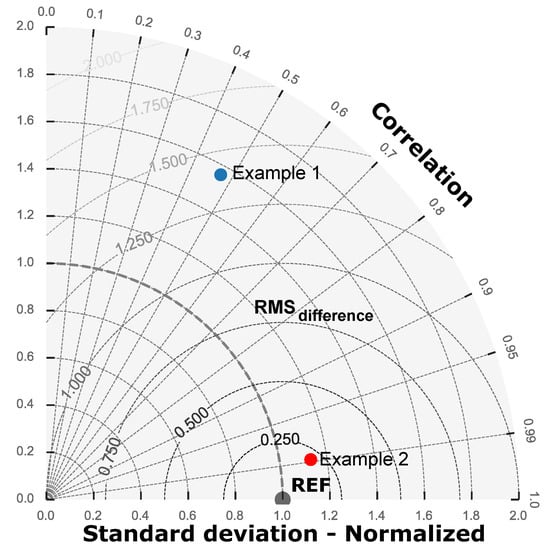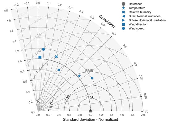 The correlation R ranges from 0 to 1, measuring the degree of similarity between two fields, with 1 being the best value. The centered root-mean-squared difference measures its adjustment in terms of amplitude, (the closer to zero means that the patterns are more similar). Both indices provide qualitative and quantitative information, but for complete characterization, it was necessary to know their variances, measured by the standard deviation. All of this information was used to quantify the pattern similarity between two time series (temperature, humidity, direct normal irradiation, diffuse horizontal irradiation, etc.); the closer they were to the center (gray point), the better. As an example (Figure 2), the comparison of the time series represented with the red dot (Example 2) had higher similarity than the one represented with the blue dot (Example 1), reaching a correlation of , a standard deviation of , and a centered root-mean-square difference of . They were virtually identical and, therefore, produced similar results that had a minor impact on the results of the simulations.