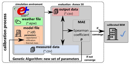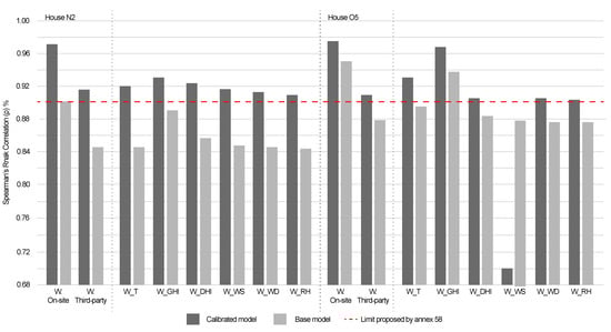In order to validate the quality of the models, the limits established by Annex 58 were used as a reference, where the BEM was valid if a mean absolute error (MAE) equal to or less than 1 C and a Spearman´s rank correlation coefficient () equal to or greater than 90% were obtained. This is because other standards, such as IPMVP or ASHRAE [26,50], do not give any reference for the evaluation of temperature, but only mention the energy behavior of the BEM. The results are presented in Section 3.2.