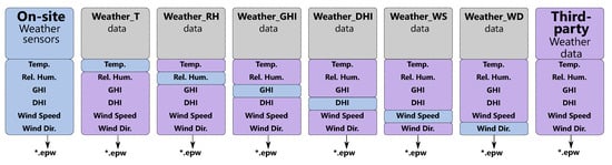 To find out if it was possible to calibrate a building using a weather file composed of a combination of data from an on-site weather station and third-party weather, it was necessary to create each of the possible weather combinations and use them to calibrate the models. In this way, it was possible to analyze which was the best combination in terms of cost/effectiveness. The data from the third-party company were used as the bases for the creation of the weather files, replacing (one by one) all of the meteorological variables measured at the on-site weather station: outside temperature (T), global horizontal irradiation (GHI), horizontal diffuse irradiation (DHI), relative humidity (RH), wind speed (WS), and wind direction (WD). In this way, six weather files were created, as seen in Figure 4.