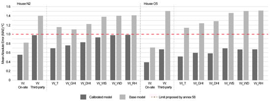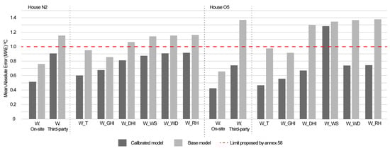 To summarize, Figure 7 and Figure 8, respectively, produce a general view of the whole process, the results of which are discussed in the tables above. The dark grey bars represent the calibrated models, while the light grey bars represent the base models, which have not undergone any calibration process. The red dotted line indicates the limit imposed by Annex 58 to judge the quality of the model. When the models are below this line in the MAE index, they meet the quality conditions set.