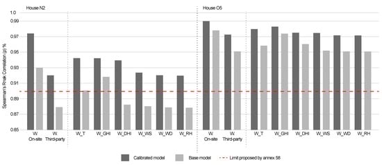 When the base models were simulated with the different weather files, only three of them complied with the limits suggested by Annex 58: the models simulated with weather files weather_T and weather_GHI and the on-site data. The others did not meet the expectations (marked in red). However, when these models underwent the calibration process, they all improved their indices, introducing them within the range set out in Annex 58.